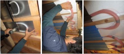 床暖房パネルに温水パイプを敷き込、赤色のアルミテープで固定します。 熱源機はヒートポンプで省エネ床暖房です。